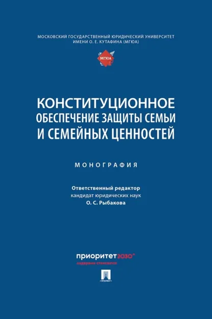 Монография подготовлена учеными Московского государственного юридического университета имени О. Е. Кутафина (МГЮА) совместно с учеными других вузов в рамках программы стратегического академического лидерства «Приоритет-2030» по проекту Центра компетенций «Социоправо» «Конституционно-правовое обеспечение государственной политики в сфере защиты института семьи и семейных ценностей России». В ней комплексно изучены вопросы конституционного и отраслевого обеспечения и защиты института семьи в России и отдельных зарубежных странах. На основе исследования отечественного опыта поддержки института семьи, большого фактического материала, обобщения правоприменительной практики авторами сформулированы и обоснованы практические предложения по формированию и реализации государственной политики в сфере защиты института семьи, поддержки материнства, отцовства и детства.