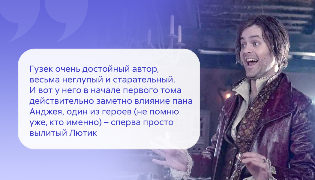 А вот Гузек очень достойный автор, весьма неглупый и старательный. И вот у него в начале первого тома действительно заметно влияние пана Анджея, один из героев (не помню уже, кто именно) – сперва просто вылитый Лютик. Но надо отдать Гузеку должное, он довольно быстро обретает полную творческую независимость. И кстати, редкий случай, но у него в трилогии каждая следующая книга лучше предыдущей.