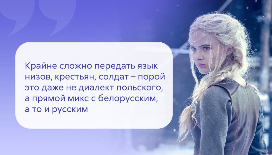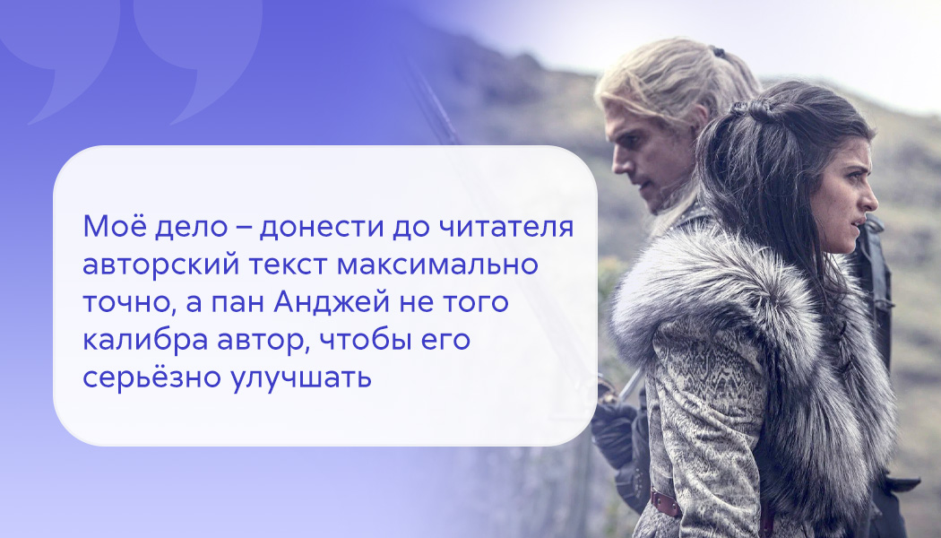 В целом я стараюсь как можно меньше отходить от текста, и это моя броня – я могу практически любую претензию перенаправить автору. Что, кстати, не так давно и сделал с пресловутым «блином» в речи Геральта. Там, если вы не в курсе, использовано жаргонное молодёжное выражение, очень всех раздражающее, – мой «блин» тоже взбесил многих, так что я попал правильно.